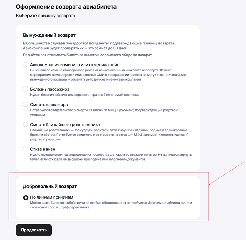 Вынужденный возврат — это возврат по веским причинам, список которых определяют авиакомпании.