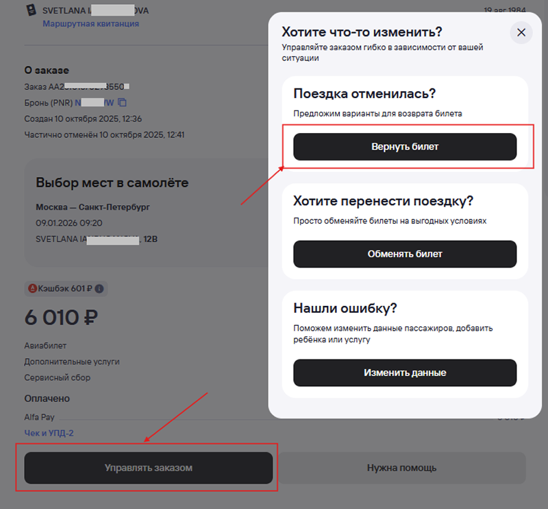 3. Нажмите Управлять заказом → Вернуть билет