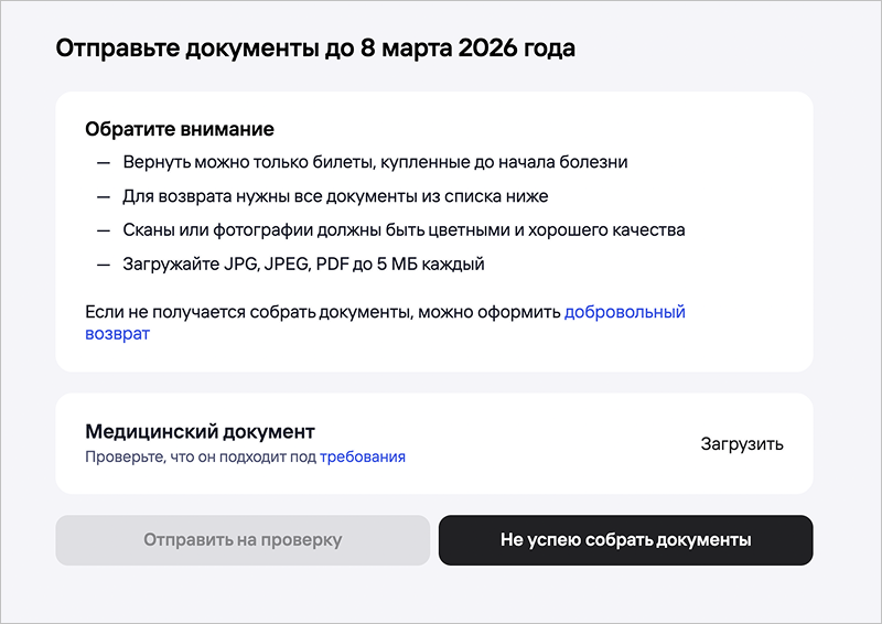 4. Укажите причину возврата: Вынужденный возврат → Болезнь пассажира