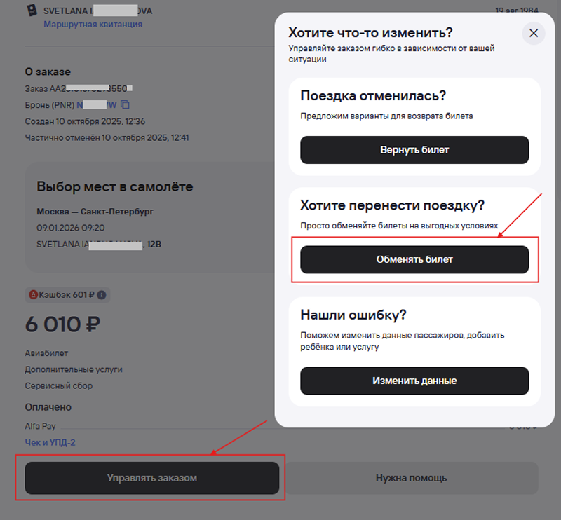 Перейдите в личный кабинет, откройте нужный заказ и нажмите Управлять заказом → Обменять билет. Укажите причину обмена: по личным причинам или из-за отмены или переноса рейса перевозчиком. Если обмен по личным причинам недоступен, значит, он не предусмотрен правилами тарифа. Причину «Авиакомпания отменила или изменила рейс» не получится выбрать, если по рейсу не было изменений.