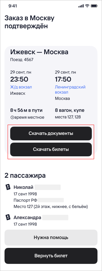 Нажмите Скачать документы, чтобы получить чек и УПД-2, или Скачать билеты — для электронных билетов